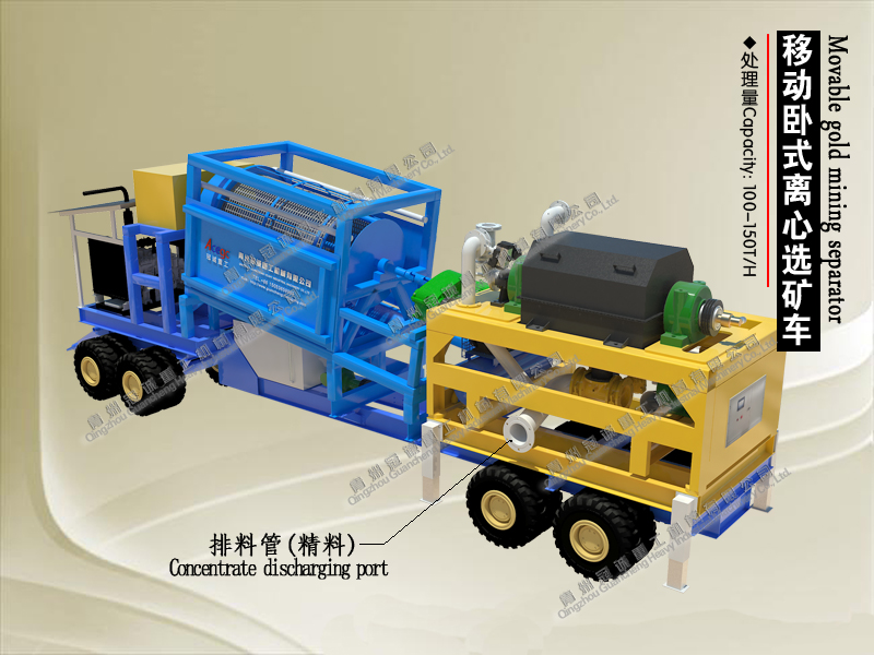 This type of movable trommel screen&horizontal centrifuge gold separating car capacity 100-150ton/h,recovery can be high to 90%,is designed by Qingzhou guangcheng heavy industry co.,Ltd from user requirement and our experience over 10years,can be moved and operate easliy, easy maintenace&seldom breakdown.